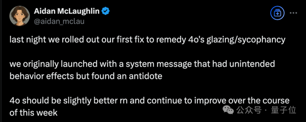 截至目前,OpenAI员工透露已经上线了第一个补丁,通过修改系统提示词缓解了一些。