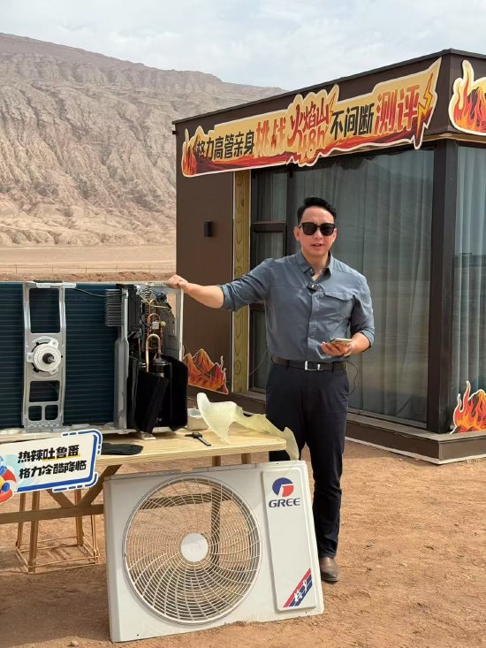 7月的吐鲁番,热浪翻涌。地表温度逼近80℃,空气如炽铁般灼人。但在这片被誉为“中国最热地方”的火焰山,格力市场总监朱磊却选择走进一间由单层玻璃和简易板材搭建的房屋,在无任何辅助制冷设备的情况下,仅靠一台格力空调支撑自己度过整整48小时的高温直播挑战。