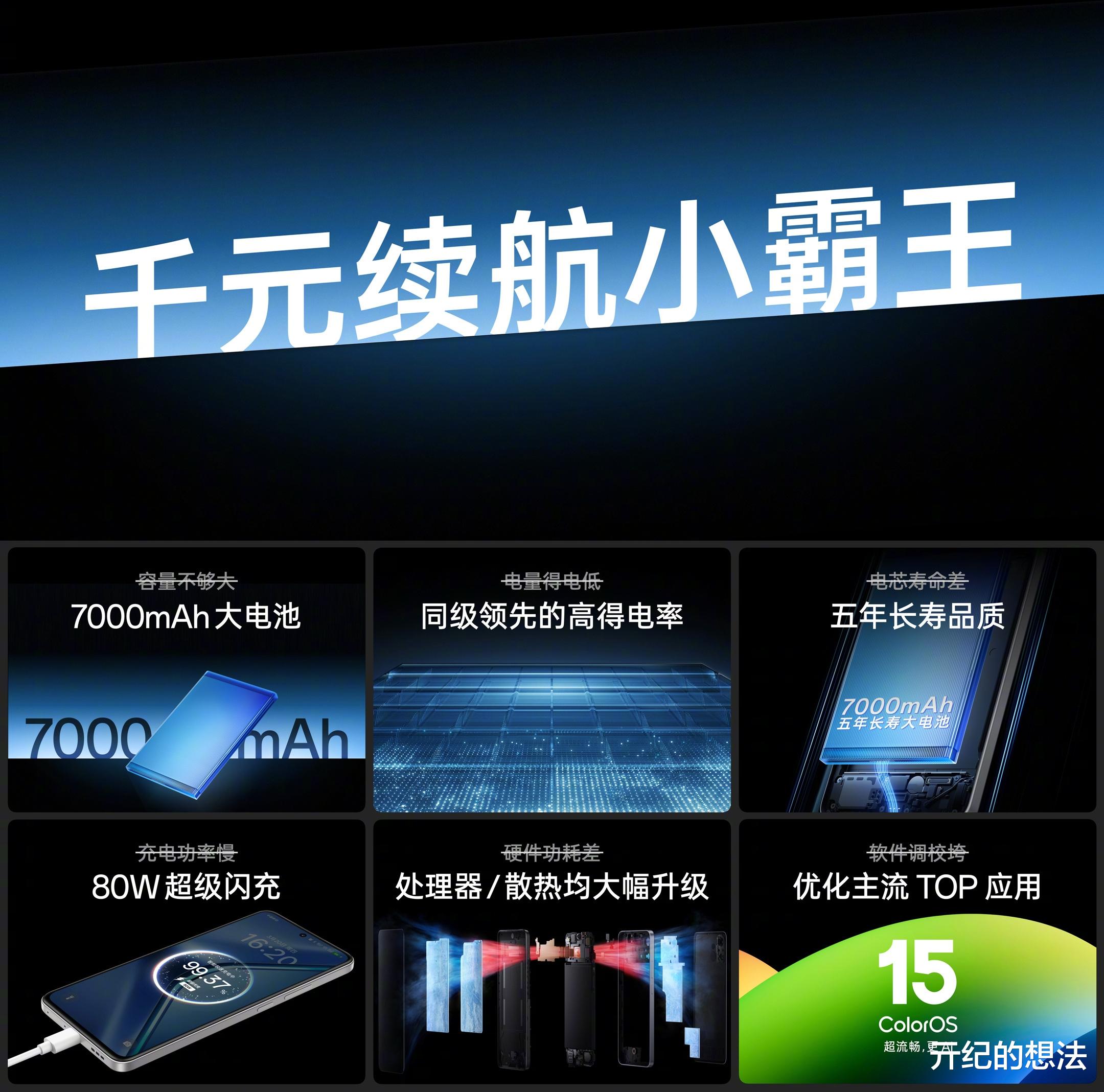 和同价位机型相比,该机的核心优势是7000毫安时大电池,搭配80W超级闪充,最快30分钟可以充电62%。系统内置自研智慧充电引擎5.0,支持极寒模式和久充保护等等,让充电更智能更安全,同时还把电池寿命提升到了5年。机身仅为8.45毫米和208克,对千元机来说在可接受范围内,有玫瑰紫、棱镜黑和星芒白三款配色。