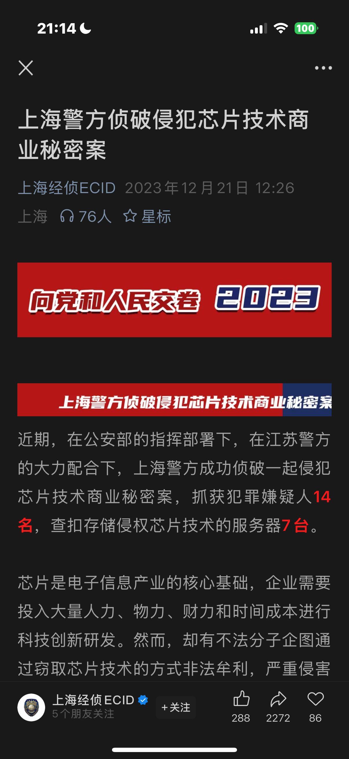 2023年12月21日,上海市公安局经济犯罪侦查总队公众号“上海经侦ECID”曾发布通报称,近期,在公安部的指挥部署下,在江苏警方的大力配合下,上海警方成功侦破一起侵犯芯片技术商业秘密案,抓获犯罪嫌疑人14名,查扣存储侵权芯片技术的服务器7台。
