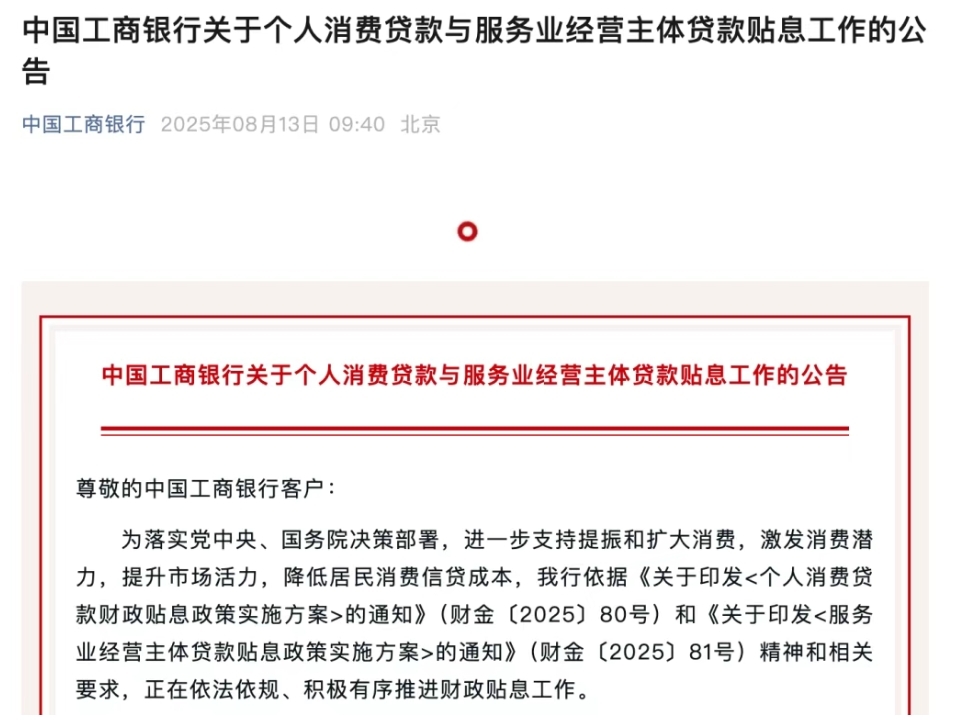 为落实党中央、国务院决策部署,进一步支持提振和扩大消费,激发消费潜力,提升市场活力,降低居民消费信贷成本,我行依据《关于印发的通知》(财金〔2025〕80号)和《关于印发的通知》(财金〔2025〕81号)精神和相关要求,正在依法依规、积极有序推进财政贴息工作。服务业经营主体贷款贴息政策实施方案>个人消费贷款财政贴息政策实施方案>