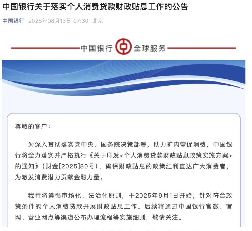 我行将遵循市场化、法治化原则,于2025年9月1日开始,针对符合政策条件的个人消费贷款开展财政贴息工作。后续将通过中国银行官微、官网、营业网点等渠道公布办理流程等实施细则,敬请关注。