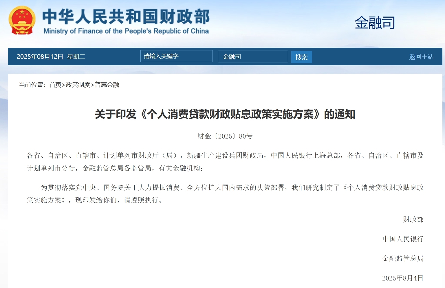 8月12日,财政部、中国人民银行、金融监管总局联合发布《个人消费贷款财政贴息政策实施方案》,对符合条件的个人消费贷款给予财政贴息。这是中央层面首次推出此类政策,引发广泛关注。