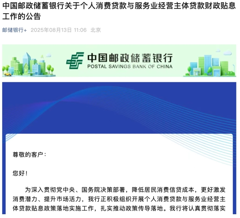 为深入贯彻党中央、国务院决策部署,降低居民消费信贷成本,更好激发消费潜力、提升市场活力,我行正积极组织开展个人消费贷款与服务业经营主体贷款贴息政策落地实施工作,扎实推动政策传导落地。我行将认真贯彻落实《关于印发的通知》(财金〔2025〕80号)、《关于印发的通知》(财金〔2025〕81号)精神及相关要求,全力确保国家政策红利及时、便捷、高效地惠及广大消费者,为提振消费信心、释放内需潜能、服务经济高质量发展贡献邮储力量。相关事宜将及时在我行官方网站、微信公众号等渠道发布,敬请留意。服务业经营主体贷款贴息政策实施方案>个人消费贷款财政贴息政策实施方案>