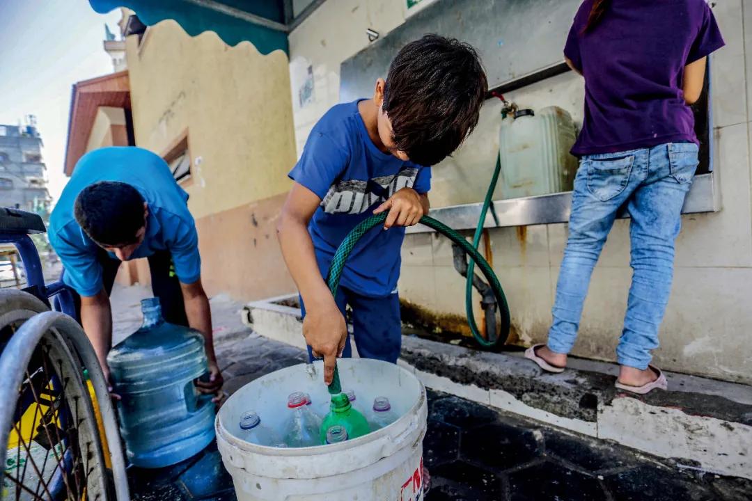 2021年9月,加沙地带严重缺乏饮用水,巴勒斯坦儿童在一处难民营里从公共水龙头接水。图/澎湃影像