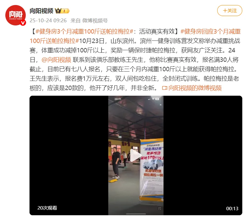 10月23日,山东滨州。滨州一健身训练营发文称举办减重挑战赛,体重成功减掉100斤以上,奖励一辆保时捷帕拉梅拉,获网友广泛关注。