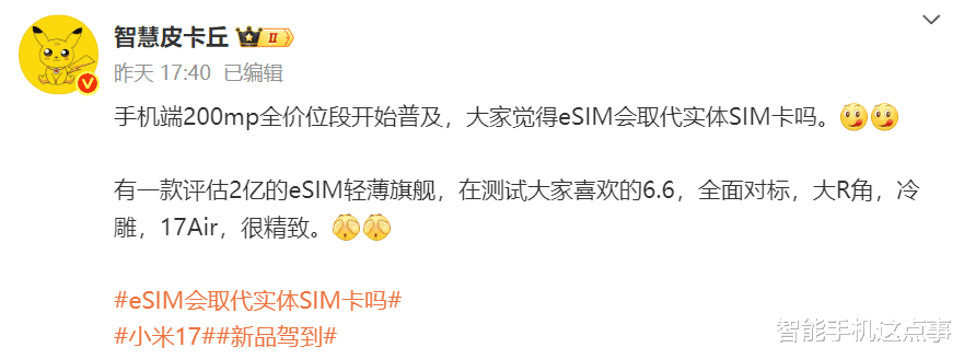 根据博主透露的信息,小米正在评估一款搭载2亿像素镜头的eSIM轻薄旗舰项目,预计命名为小米17 Air。