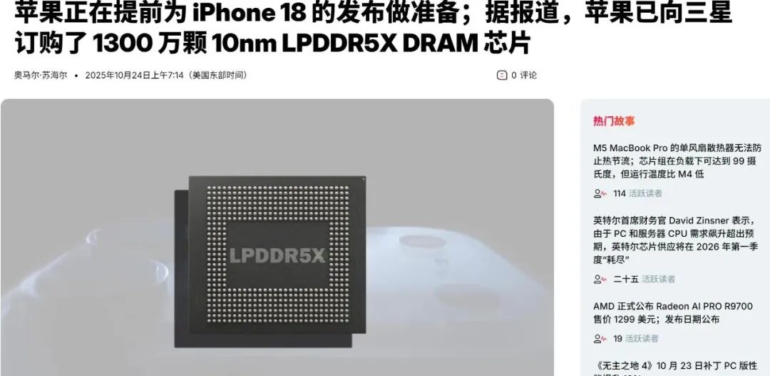 为什么?因为成本又开了挂。首先,iPhone 17 系列中,Pro、ProMax 版已经升级到12 GB 运存。据韩媒 The Bell 报道,苹果提前向 Samsung Electronics 订购了 1,300 万颗 LPDDR5X 内存芯片,并且还计划追加订单,以应对 AI 需求激增带来的成本压力。该批内存将用于下一代 iPhone18 系列,即便是标准版也会从 8 GB 升级至 12 GB。