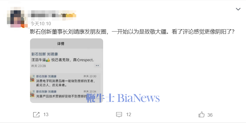 10月29日消息,据网友曝料,影石创新董事长刘靖康近日发布朋友圈,点名大疆董事长汪滔垄断。