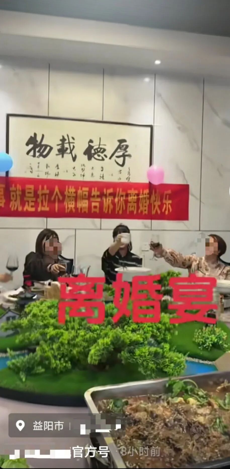 10月29日,网友发布的视频显示,益阳市区一家餐馆门前,设立了一个红色拱门,门上写有“祝詹小姐离婚快乐从此脱离苦海”的横幅,墙上还有“开业期间赠送礼品”的横幅。包厢内,当事人和朋友举杯庆祝。
