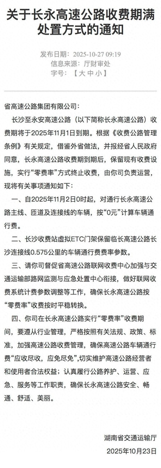 服务近31年后,2025年11月2日0时起,长永高速公路实行“零费率”方式,终止收费,成为湖南首条长期免费的高速公路。所谓“零费率”,即对通行本路段的所有车辆按“0元”计算车辆通行费,并代为收取其他路段的车辆通行费。
