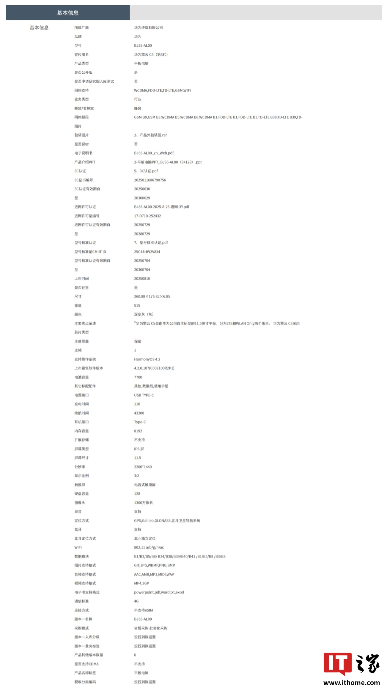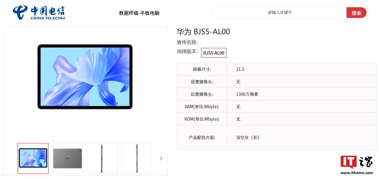 IT之家11月9日消息,华为型号为“BJS5-AL00”的华为擎云C5(第3代)平板已现身中国电信终端产品库。该机提供深空灰(灰)配色,产品零售价格及规格版本尚未公布。