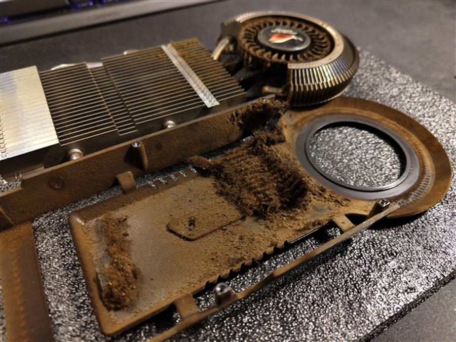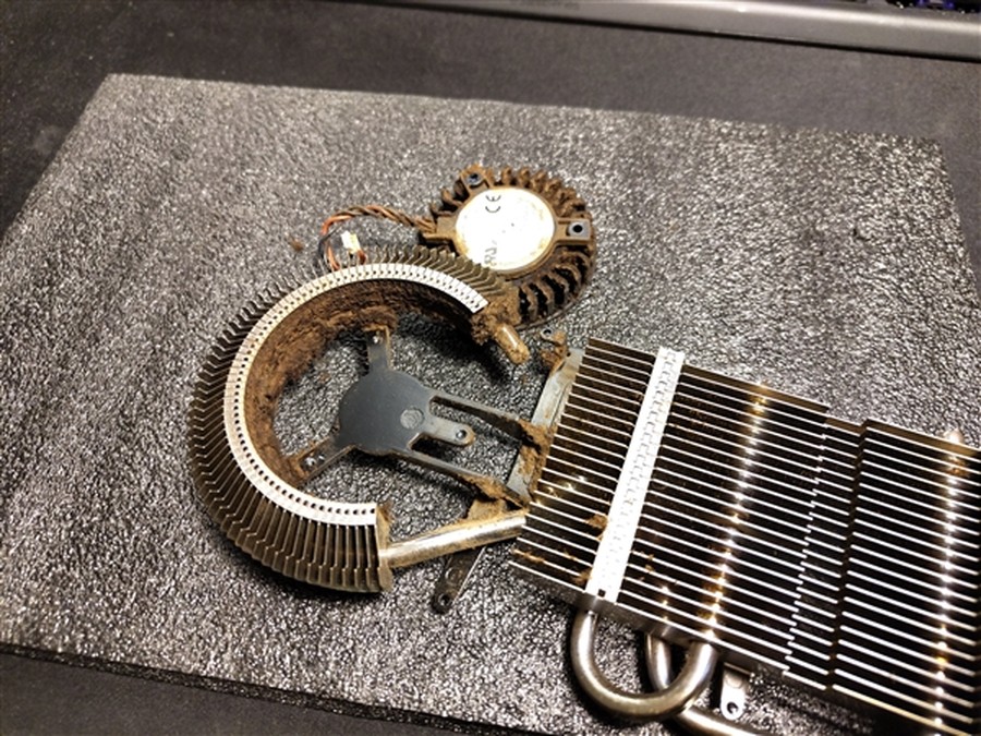 这款华硕ROGMatrix9800GT显卡于2008年上市,原本是面向发烧友的高端中端显卡。然而,经过17年的长时间使用且没有得到任何维护,显卡的散热片完全被污垢堵塞,显卡外观看起来相对干净,但拆开后,散热片几乎所有表面都被灰尘和污垢覆盖,特别是在散热罩下方的堆积更为严重。Madness727甚至开玩笑地说,面对这堆污垢,他都不敢轻易吹气,害怕自己也会被这些有害物质感染。