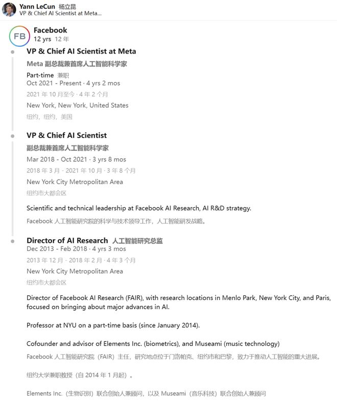 2018年,他卸任主任一职,转任Facebook首席人工智能科学家,专注于战略规划和科学领导力。