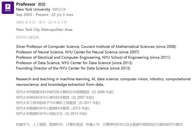 2003年,LeCun离开工业界,前往纽约大学库朗数学科学研究所担任计算机科学教授。