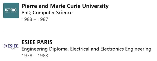 后来,他在法国精英工程师学校之一的巴黎高等电子与电工工程师学院(ESIEEParis)获得了相当于硕士的学位。在那里,他专注于微芯片设计与自动化。