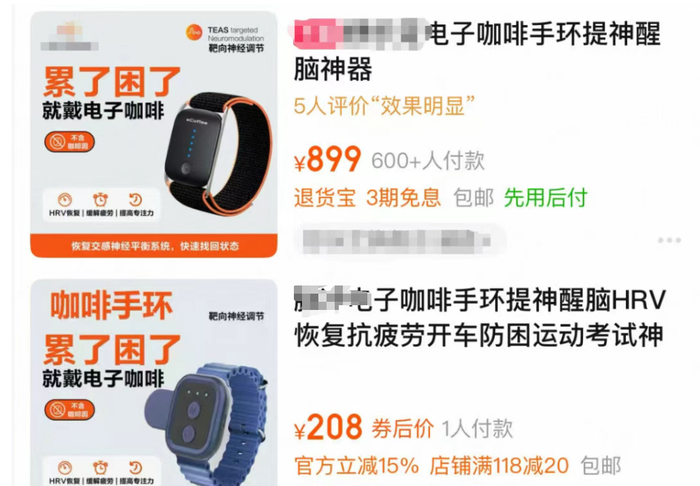 记者在电商平台搜索发现,有商家的“电子咖啡手环”已经有700余人看过,600余人付款购买。不同商家、不同品牌的“电子咖啡手环”售价在200-1000元不等。在商品页最显眼的位置,写着“累了困了,就戴电子咖啡”,下方紧跟的“不含咖啡因”标识直击痛点。据描述,长期佩戴不仅能从深层改善疲劳体质、缓解压力,还能通过提升HRV指标来优化运动恢复,更能在佩戴者需要时迅速提升注意力,使其高效进入学习与工作状态。