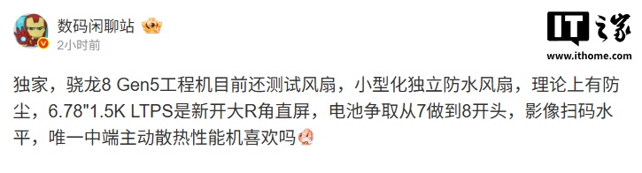 IT之家11月21日消息,博主@数码闲聊站今日爆料,某厂骁龙8Gen5工程机测试小型化独立防水风扇,理论上有防尘功能,6.78"1.5KLTPS是新开大R角直屏,电池争取从7做到8开头,影像扫码水平,唯一中端主动散热性能机。结合该博主此前的爆料习惯,预计这款新品为OPPO旗下。