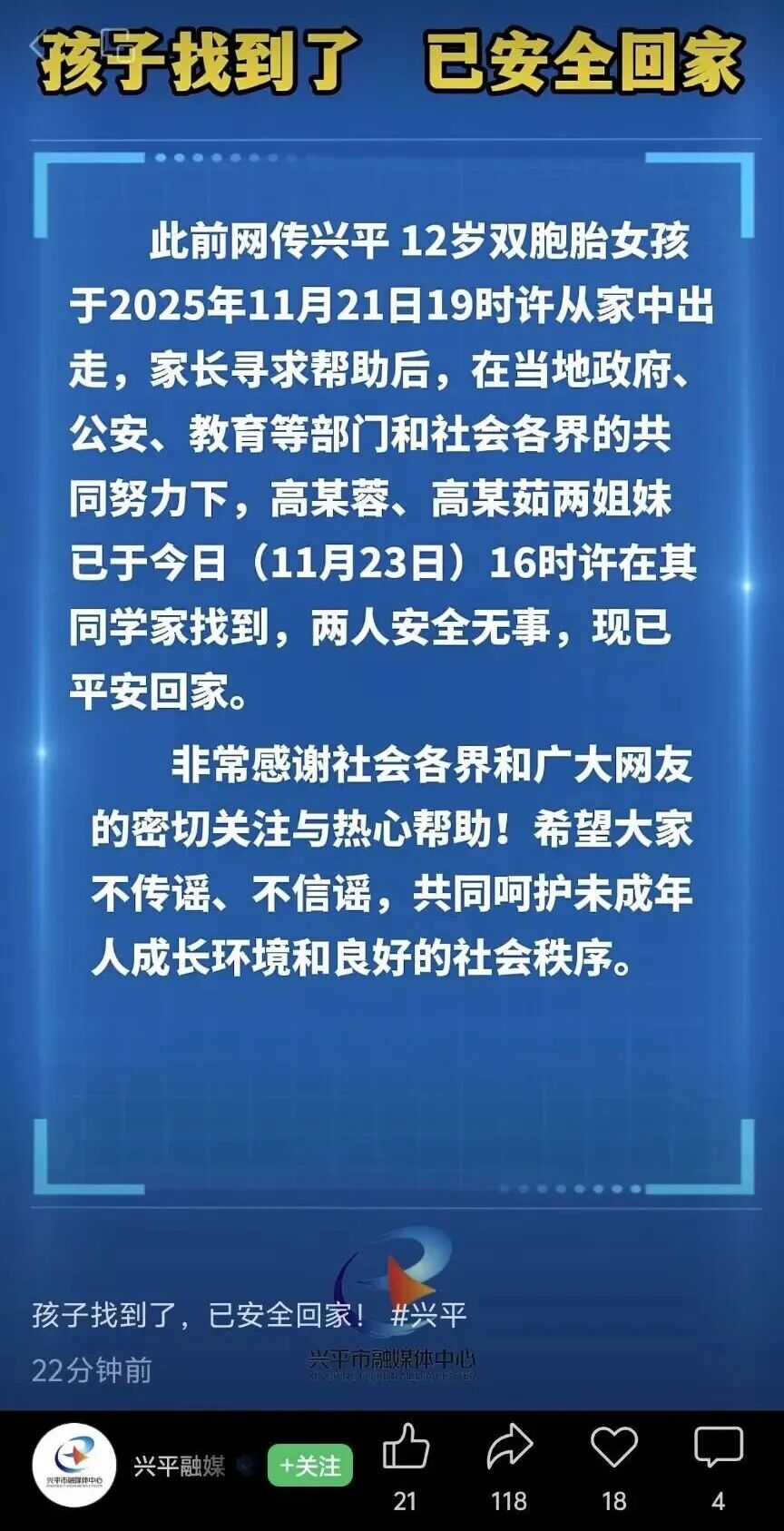 据“兴平融媒”发布的通报:此前网传兴平12岁双胞胎女孩于2025年11月21日19时许从家中出走,家长寻求帮助后,在当地政府、公安、教育等部门和社会各界的共同努力下,高某蓉、高某茹两姐妹已于今日(11月23日)16时许在其同学家找到,两人安全无事,现已平安回家。