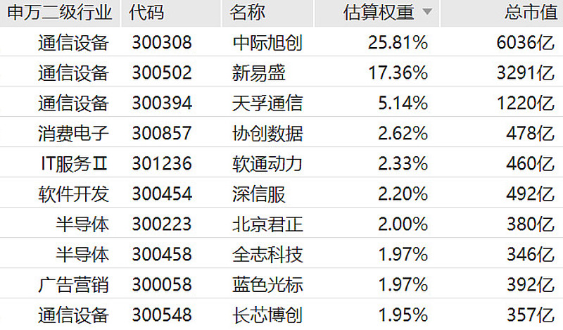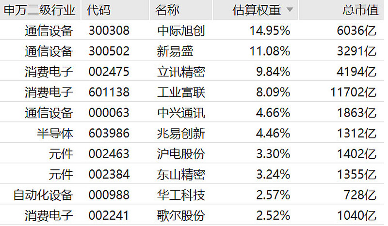5G通信ETF前十大持仓股:中际旭创、新易盛、立讯精密等