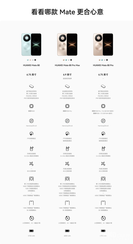 可靠性:均采用第二代昆仑玻璃,具备IP68级6米抗水、IP69级抗高温高压喷水能力。其中,Mate80与Mate80Pro采用超可靠玄武架构,Mate80ProMax则升级为全金属玄武架构,进一步强化了机身强度。