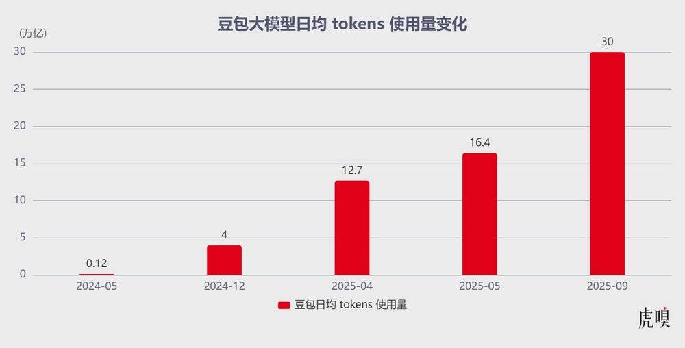即便阿里云、腾讯云接招迅速,火山引擎仍尝到了“敢为行业先”的甜头——虎嗅了解到,截至2025年9月,豆包大模型日均处理30万亿Tokens,相比2024年5月首次推出时增长了25300%。