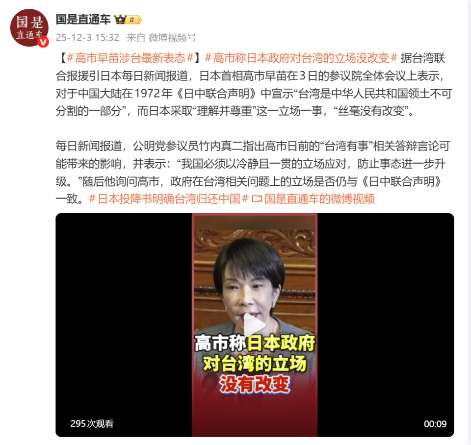 据台湾联合报援引日本每日新闻报道,日本首相高市早苗在3日的参议院全体会议上表示,对于中国大陆在1972年《日中联合声明》中宣示“台湾是中华人民共和国领土不可分割的一部分”,而日本采取“理解并尊重”这一立场一事,“丝毫没有改变”。
