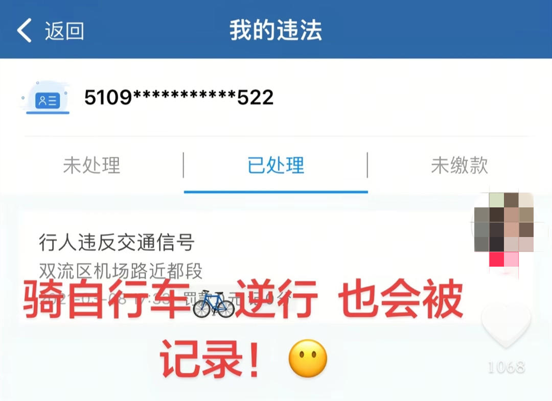 日前,网友“Alshu”发布视频称,其在双流机场路近都段骑自行车逆行被抓,逆行信息还被上传至“交管12123”App。这一经历引起了不少网友讨论。