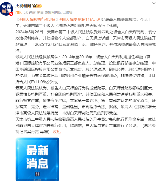 2月24日,天津市高级人民法院对中国华融国际控股有限公司原总经理白天辉受贿上诉案二审公开宣判,裁定驳回上诉,维持死刑判决,并依法报请最高人民法院核准。