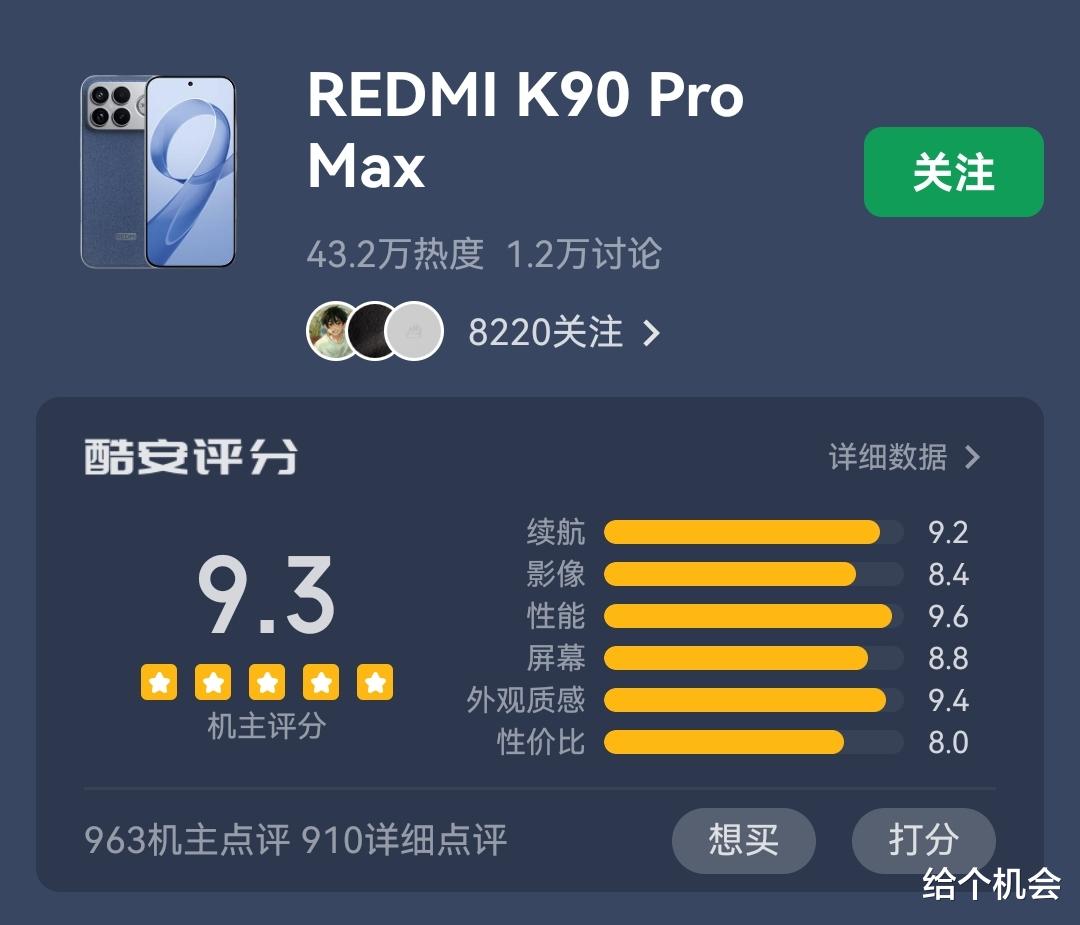 在酷安最新论坛综合评分排行中,红米k90 pro max的评分提升到9.3,近期热度攀升,现在某东平台有补贴降价,购买的人也增加了不少。