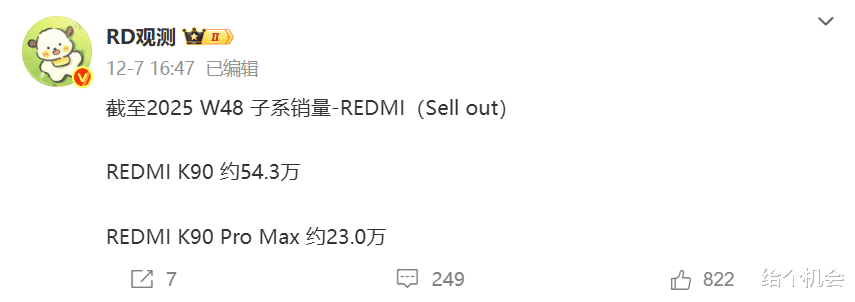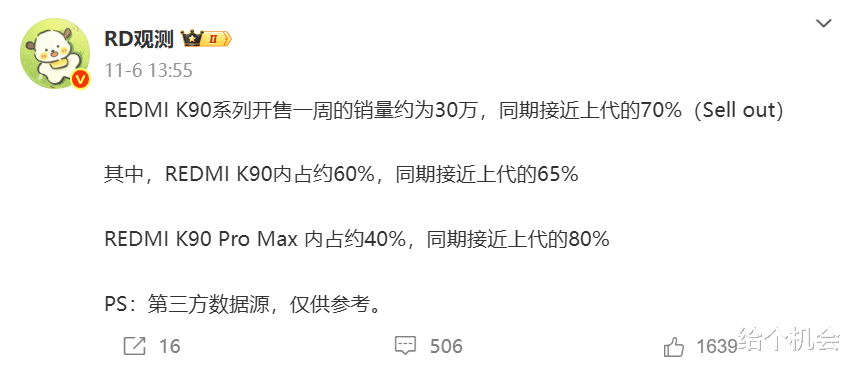 当时一上市不仅被吐槽,销量也确实受到了影响,据博主RD观测统计的数据显示,红米k90 系列开售一周仅有30万台销量,同期不如上代,红米k90 pro max比起上代也出现下滑。