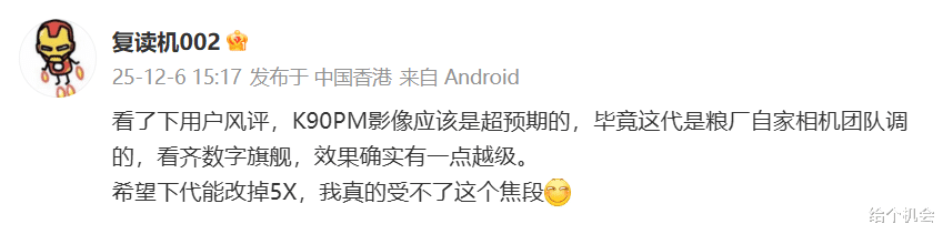 据博主数码闲聊站发文称,红米k90 pro max风评变好的原因在于影像,拍照方面是有超预期的,整体有所越级,加上音质也确实不错,吸引了很多用户。
