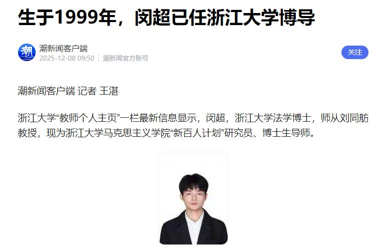 刚刚过去的几天,浙江大学马克思主义学院的一则人事任命,悄然在舆论场投下一颗“震撼弹”——26岁的闵超,被正式聘为“新百人计划”研究员、博士生导师。