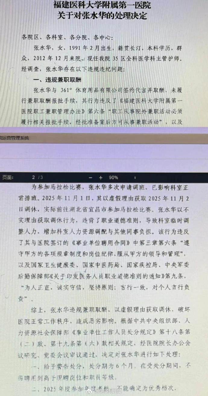 记者注意到,这份处理决定显示,张水华存在违规兼职取酬的行为。此前,张水华曾是361度代言人,因为哈尔滨马拉松后的争议,品牌火速宣布与其解约。医院查明她与361度签约代言,并取得了报酬,这属于本职工作外的兼职行为,由于事前没有向医院报批,违反了医院的管理办法,只有经过批准才可以从事兼职活动。