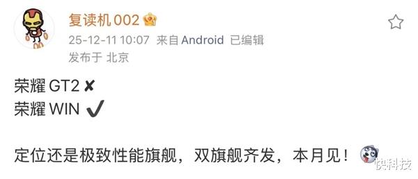 12月11日上午,数码圈知名爆料博主@复读机002(数码闲聊站小号)透露重磅消息——原“荣耀GT2”将正式更名为“荣耀WIN”,定位依旧是极致性能旗舰,本月正式登场。