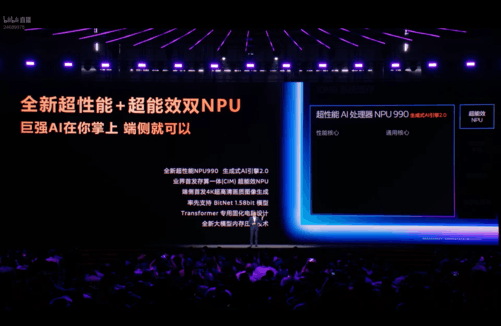天玑9500搭载革命性双NPU架构——超性能NPU990与超能效NPU协同工作,赋予智能手机突破性AI能力。其中,超性能NPU990专为极致端侧AI体验设计:峰值性能较前代跃升111%,在大语言模型摘要输出、多模态交互理解等核心场景实现质变,更首创支持4K高清文生图功能;在能效维度,其峰值功耗大幅降低56%,确保高性能与长续航并存。该芯片集成生成式AI引擎2.0,率先适配BitNet1.58bit大模型运算,通过压缩存储需求显著降低推理功耗,实现“高效+低耗”的双重突破。