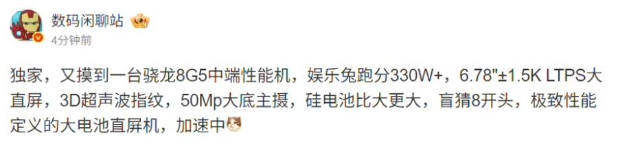 数码圈知名博主@数码闲聊站今日在微博放出重磅爆料,一款搭载骁龙8Gen5芯片的新机将配备1.5K分辨率、165Hz刷新率的三星大直屏。结合博主暗示及评论区用户猜测,这款机型大概率是realme真我Neo8。
