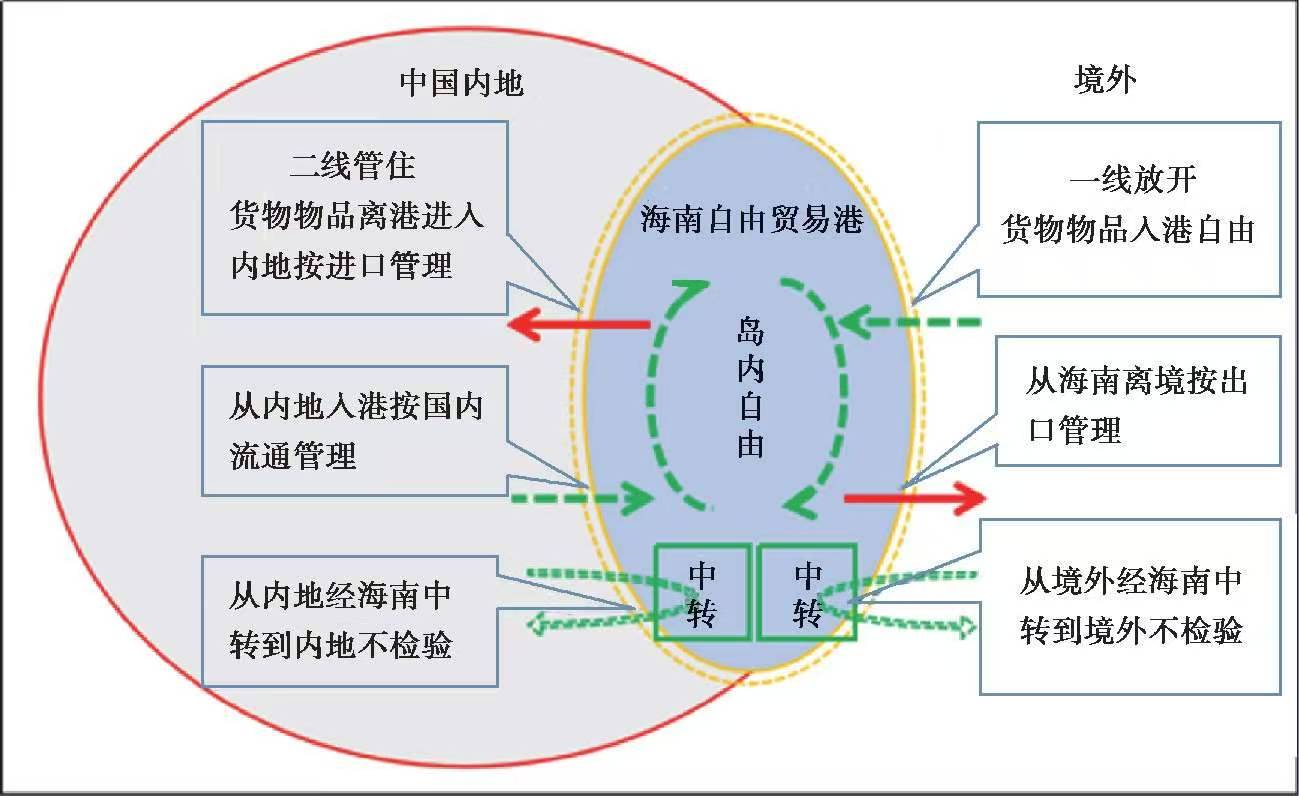 “一线”指海南与境外间,实施高水平贸易投资自由化便利化,多数境外商品免关税等。“二线”指海南与内地间,对进出商品、人员等精准监管,防范大量境外商品无序冲击内地市场。岛内各类要素可相对自由流动。