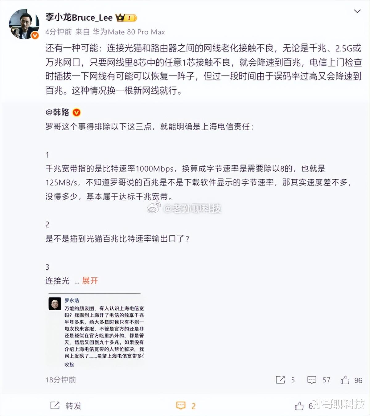 作为技术大佬,又是华为相关技术的负责人,李小龙的建议非常正确,因为确实无法排除存在网线问题。不过也有网友指出,罗永浩也不是普通小白,从事手机行业那么多年认知远超普通人,半年时间受到网速折磨会想不到更换网线吗?很有可能是其他原因导致。而且罗永浩也说明找客服之后能解决问题,没有说是到现场插拔网线,说明运营商可以远程控制,真正的速率下降应该不是硬件出现问题,很有可能出在了运营商端。