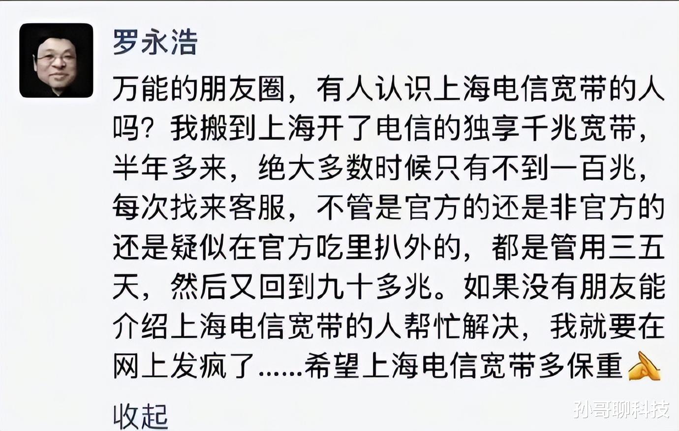 先来看事件原因,最早老罗在朋友圈发布一条吐槽内容,求问朋友圈里有没有认识某地某运营商的朋友。原因是搬到当地之后,用了某运营商千兆宽带半年左右,绝大多数时候速率只有不到100兆每次找客服,反映问题速率恢复正常只有3~5天,最高速率回到90多兆左右。如果有人认识当地运营商的朋友帮忙解决一下,要是没人在中间调解,威胁当地运营商自己“在网上发疯”。