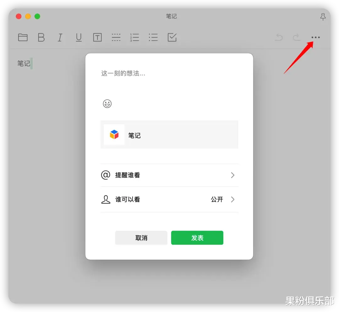 在 PC 端微信内编辑好笔记,即可点击右上角的「…」选项,将其转发至朋友圈。