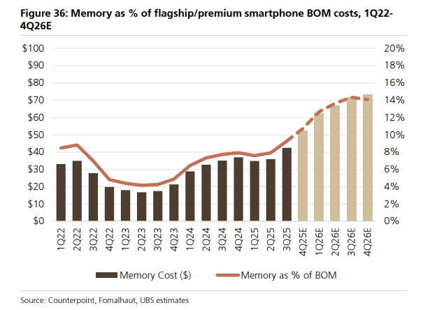 瑞银通过拆解报告和销售数据算了一笔账:对于那些卖得贵的旗舰手机,到2026年底,内存成本在总成本(BOM)中的占比会从现在的8%爬升到14%。虽然单台手机的内存成本会从52美元跳到73美元,涨了41%,但这20多美元的增量对于一部大几千块的手机来说,只占平均售价的2%左右。靠着品牌溢价和更高的利润率,头部品牌其实还有「缓冲垫」来消化这部分成本。