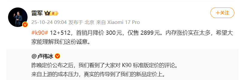 从今年11月开始,就有不少国产手机品牌的高管,在微博上开始发出警告,表示2025年智能手机成本上涨幅度将会非常惊人;包括雷军、卢伟冰等大佬纷纷发声,足见此次「超级周期」给行业带来的巨大压力。