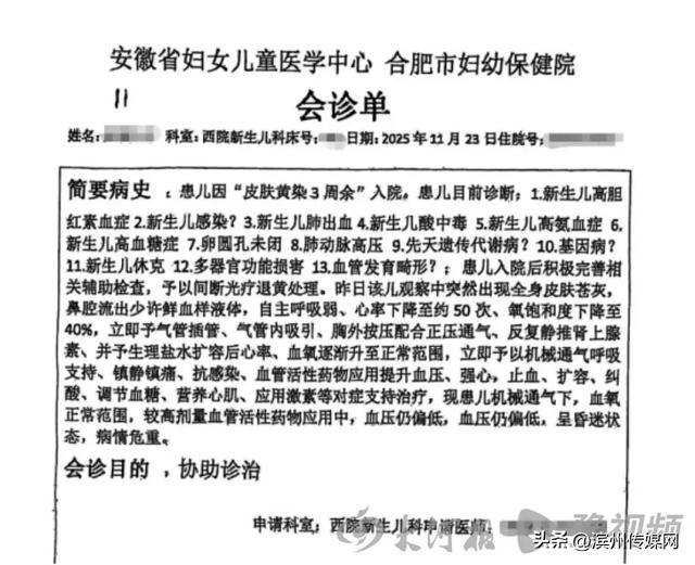 陈先生介绍,孩子于2025年10月27日在合肥市妇幼保健院西区剖宫产出生,出生后因黄疸未退,于11月20日到该院新生儿科住院,接受蓝光治疗。由于新生儿科实行封闭管理,不允许家属陪护,仅每周一、三、五通过电话告知孩子情况。21日,医院电话告知孩子一切正常,黄疸值虽有反弹但无需担忧。