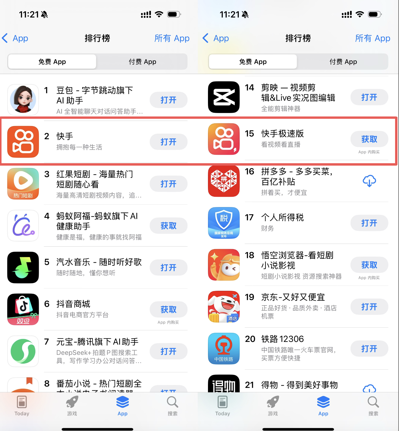 截至23日午间,记者查询苹果商店页面发现,快手居免费App排行榜第二名,快手极速版居第15名。
