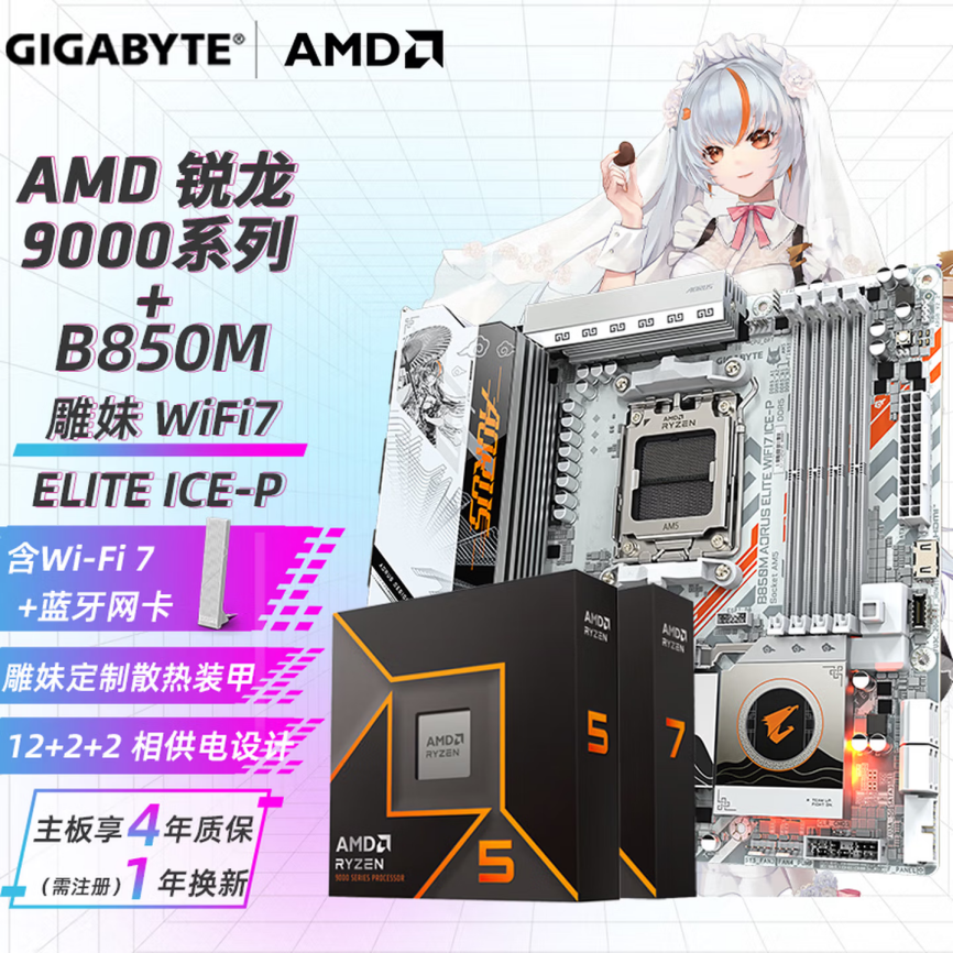 推荐入手技嘉B850M AORUS ELITE WIFI7 ICE-P雕妹板U套装,性价比优势远超单独购买。这款主板不仅拥有齐全的接口(PCIe 5.0、Wi-Fi 7和2.5G网卡等)、大面积全覆盖散热模块与扎实用料,更提供4年超长质保,彻底打消后期使用顾虑,能100%释放锐龙7 9700X的性能潜力,无须担心供电瓶颈。