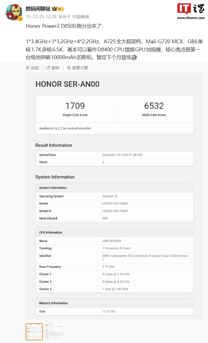 IT之家12月25日消息,型号为SER-AN00的新机跑分已公布:单核1709、多核6532,博主@数码闲聊站今日发文称,该机为荣耀Power2,搭载“D8500”处理器,核心亮点是第一台电池突破10000mAh的新机,暂定下个月登场。
