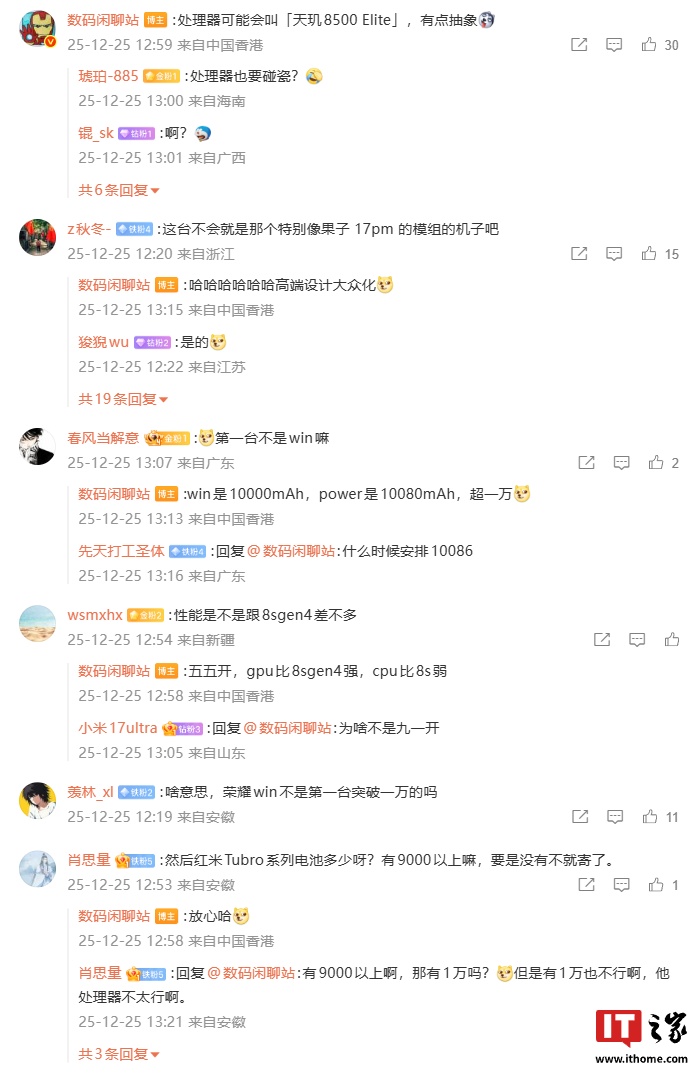 博主还补充称,这款处理器可能会叫「天玑8500Elite」。针对第一台电池突破10000mAh的新机这一说法,博主解释称:“WIN是10000mAh,Power是10080mAh,超一万。”