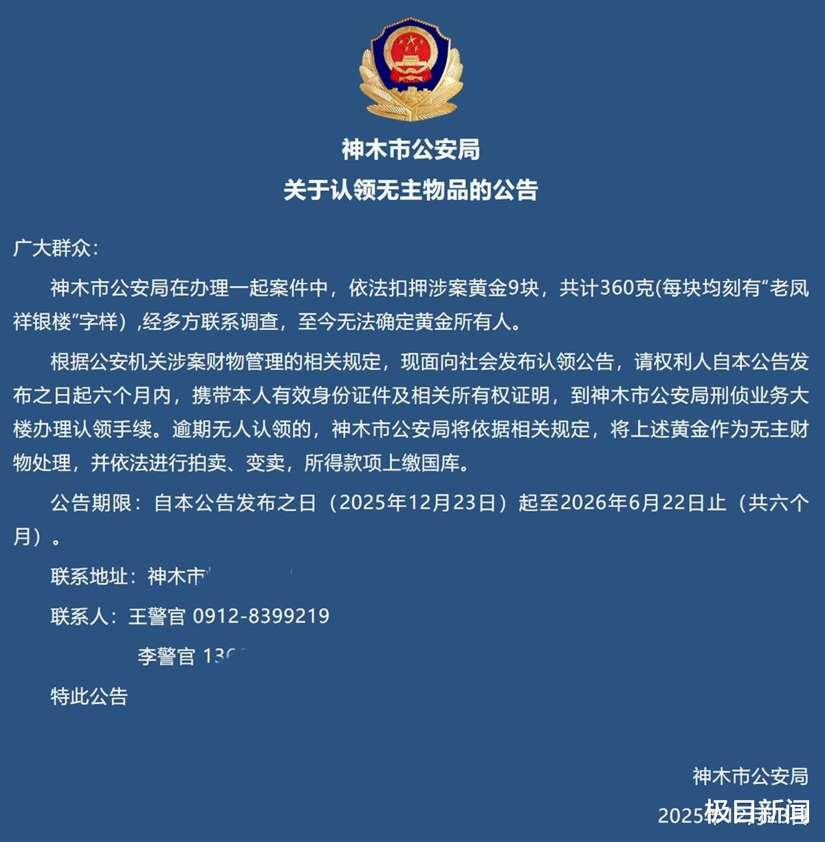 公告指出,根据公安机关涉案财物管理的相关规定,现面向社会发布认领公告,请权利人自本公告发布之日起六个月内,携带本人有效身份证件及相关所有权证明,到神木市公安局刑侦业务大楼办理认领手续。逾期无人认领的,神木市公安局将依据相关规定,将上述黄金作为无主财物处理,并依法进行拍卖、变卖,所得款项上缴国库。
