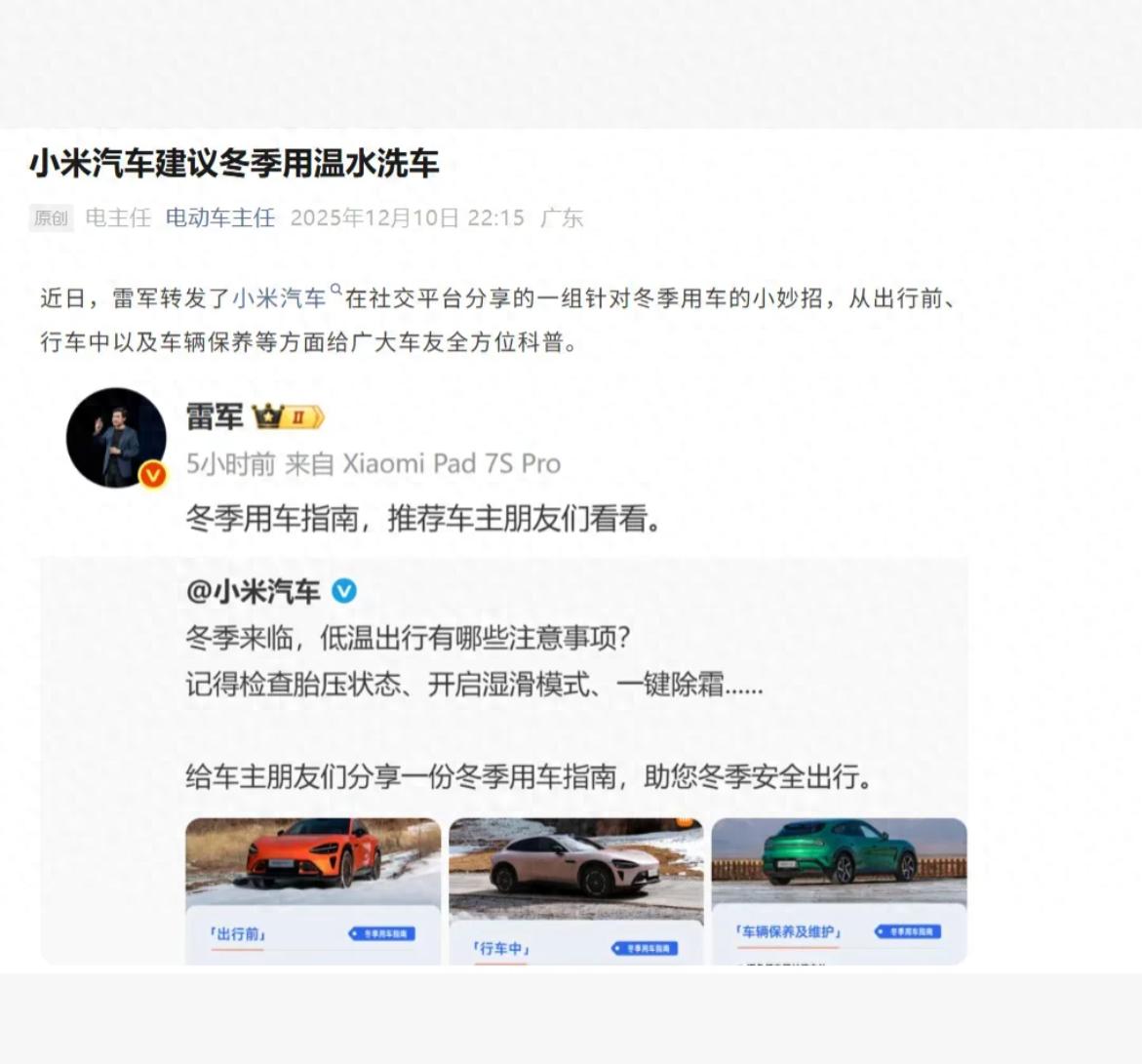 雷军刚转发小米汽车的冬季用车指南,就把车主们惹出了火气 —— 指南里 “建议冬季用温水洗车” 的细节,直接被吐槽 “合着开车得供着车子呗”。明明是一份好心的用车提醒,为啥会引发 “车子到底是工具还是祖宗” 的争论?温水洗车的建议,到底是科学还是矫情?